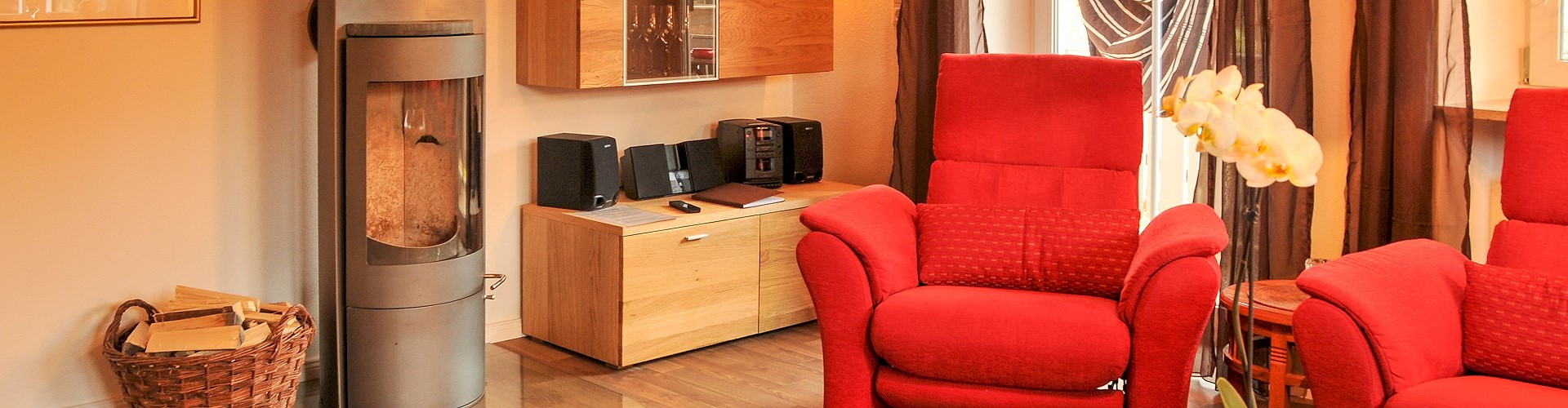 - ein Wohnzimmer mit Kaminofen und gemütlicher Sitzgruppe mit 2 Relaxsesseln, großer Flachbild-TV, DVD, Stereoanlage, Internetanschluss