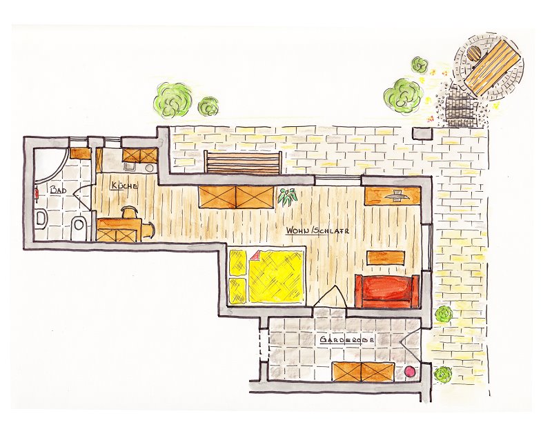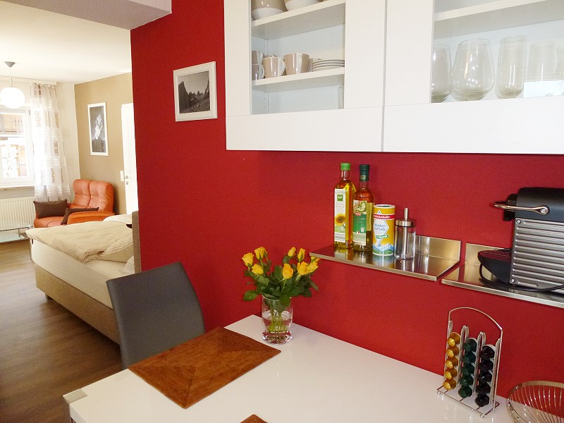 - ein modern eingerichtetes 1-Zimmer- Appartement mit Wohn-Schlafbereich (Küchenzeile mit Ceranfeld, 2-Plattenherd, Mikrowelle mit Grill, Kaffeemaschine, Nespresso-Maschine, Wasserkocher, Kühlschrank), Essbereich, Sofaecke mit gemütlichem Himolla-Sofa (mit Nackenverstellung) mit Flachbild-Sat-TV, DVD-Player, Radio, Schlafbereich mit modernem Boxspring-Bett, ein Bad mit Dusche/WC und eine Garderobe